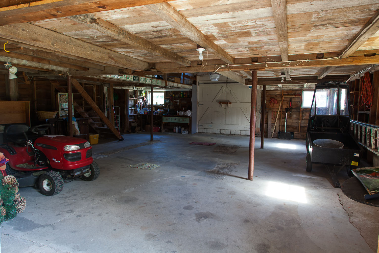 The antique barn, (30 x 34 ft.*) provides 1020 sq.ft. on the ground level with a concrete floor. Storage is greatly expanded with two upper levels. The barn is equipped with an automatic ventilating fan for hot summer days. Suitable for parking up to 5 cars, agricultural equipment, and general storage the barn can be considered useful for many purposes. The barn has a large work bench built in with drawer storage. Windows allow natural daylight illumination. As the barn has housed no animals for 15 years, there is no agricultural smell. The current owners have held many club meetings and workshops in this well-lit space. It could be readily adapted to an antique shop, a wedding business, a work area for craftsmen or converted to stalls for animals. From the house, the barn has indoor access through the garage. Great for cold snowy days.